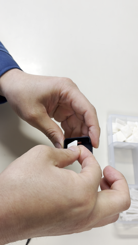 剥離紙を剥がしたシールを、ケース内側の中央に合わせて貼り付けます。